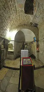 La plus ancienne des deux églises du monastère est l'église Saint-Michel-et-Saint-Gabriel. Cette église, en partie rupestre, est constituée d'une nef unique, prolongée par une abside demi-circulaire et surmontée d'une petite coupole aveugle[3]. Difficile à dater, elle remonte peut-être à la construction du monastère[5]. L'église abrite quelques fresques mais les spécialistes sont partagés sur leur style qui pourrait tout aussi bien les faire remonter au XIIIe siècle qu'au XVIe siècle[3].