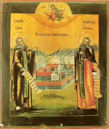 Icône du XIXe siècle représentant le monastère avec Saint-Serge à gauche et Saint-Germain (ou Herman) de Valaam à droite.
