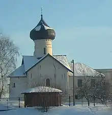 Le catolicon du monastère est l'église de l'Intercession de la Mère de Dieu qui est connue depuis le XIIe siècle. Au début elle était construite en bois, puis en 1335 l'archevêque Vasili construisit à sa place une église en pierre. L'édification se poursuivit jusqu'en 1399. Après une dévastation due à la guerre avec les Suédois l'église est consacrée à la fête de la Déposition de la robe de la Vierge. En 1851 l'écrivain, homme d'État russe Ivan Muravyov-Apostol (en) (1762-1851) est enterré à proximité de l'église.