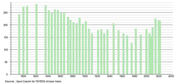 L'évolution du nombre d'habitants est connue à travers les recensements de la population effectués dans la commune depuis 1793. Pour les communes de moins de 10 000 habitants, une enquête de recensement portant sur toute la population est réalisée tous les cinq ans, les populations légales des années intermédiaires étant quant à elles estimées par interpolation ou extrapolation[22]. Pour la commune, le premier recensement exhaustif entrant dans le cadre du nouveau dispositif a été réalisé en 2004[23].