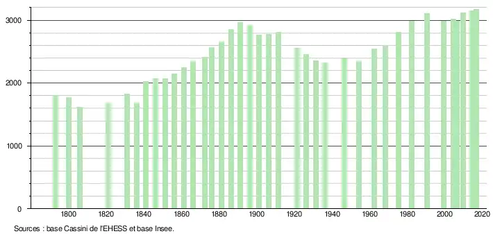 L'évolution du nombre d'habitants est connue à travers les recensements de la population effectués dans la commune depuis 1793. Pour les communes de moins de 10 000 habitants, une enquête de recensement portant sur toute la population est réalisée tous les cinq ans, les populations légales des années intermédiaires étant quant à elles estimées par interpolation ou extrapolation[17]. Pour la commune, le premier recensement exhaustif entrant dans le cadre du nouveau dispositif a été réalisé en 2004[18].