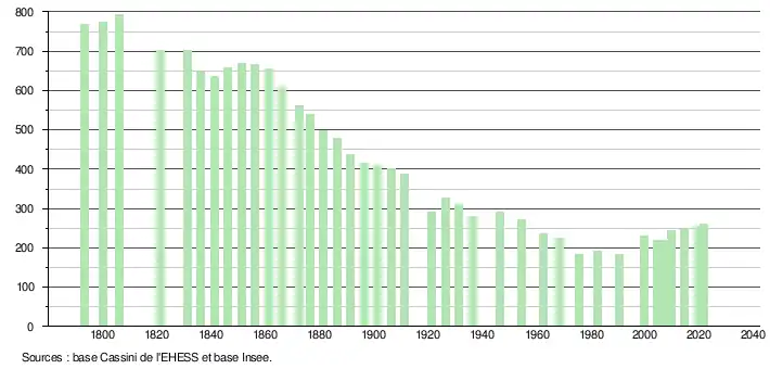 L'évolution du nombre d'habitants est connue à travers les recensements de la population effectués dans la commune depuis 1793. Pour les communes de moins de 10 000 habitants, une enquête de recensement portant sur toute la population est réalisée tous les cinq ans, les populations légales des années intermédiaires étant quant à elles estimées par interpolation ou extrapolation[23]. Pour la commune, le premier recensement exhaustif entrant dans le cadre du nouveau dispositif a été réalisé en 2004[24].
