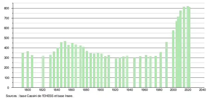 L'évolution du nombre d'habitants est connue à travers les recensements de la population effectués dans la commune depuis 1793. Pour les communes de moins de 10 000 habitants, une enquête de recensement portant sur toute la population est réalisée tous les cinq ans, les populations légales des années intermédiaires étant quant à elles estimées par interpolation ou extrapolation[40]. Pour la commune, le premier recensement exhaustif entrant dans le cadre du nouveau dispositif a été réalisé en 2004[41].