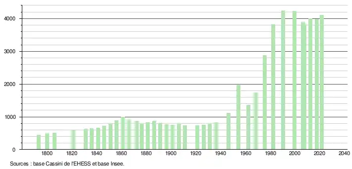 L'évolution du nombre d'habitants est connue à travers les recensements de la population effectués dans la commune depuis 1793. Pour les communes de moins de 10 000 habitants, une enquête de recensement portant sur toute la population est réalisée tous les cinq ans, les populations légales des années intermédiaires étant quant à elles estimées par interpolation ou extrapolation[28]. Pour la commune, le premier recensement exhaustif entrant dans le cadre du nouveau dispositif a été réalisé en 2007[29].