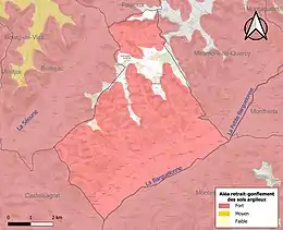 Le retrait-gonflement des sols argileux est susceptible d'engendrer des dommages importants aux bâtiments en cas d’alternance de périodes de sécheresse et de pluie. 89,2 % de la superficie communale est en aléa moyen ou fort (92 % au niveau départemental et 48,5 % au niveau national). Sur les 200 bâtiments dénombrés sur la commune en 2019, 158 sont en aléa moyen ou fort, soit 79 %, à comparer aux 96 % au niveau départemental et 54 % au niveau national. Une cartographie de l'exposition du territoire national au retrait gonflement des sols argileux est disponible sur le site du BRGM[22],[Carte 3].