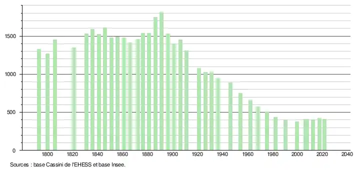 L'évolution du nombre d'habitants est connue à travers les recensements de la population effectués dans la commune depuis 1793. Pour les communes de moins de 10 000 habitants, une enquête de recensement portant sur toute la population est réalisée tous les cinq ans, les populations légales des années intermédiaires étant quant à elles estimées par interpolation ou extrapolation[24]. Pour la commune, le premier recensement exhaustif entrant dans le cadre du nouveau dispositif a été réalisé en 2007[25].