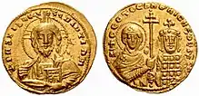 La monnaie byzantine, utilisée dans l’Empire romain d’Orient après la chute de Rome en 476, reposait sur deux types de pièces : le solidus (pl. solidi) d’or qui sera appelé nomisma (pl. nomismata)[N 1] lorsque le grec remplaça le latin comme langue d’administration, et diverses pièces de bronze. Les pièces d’argent, absentes au début de l’empire en raison de la difficulté de fixer leur parité avec l’or, ne firent leur apparition que vers la fin de l’empire.