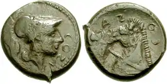 - Les monnaies du type Minerve présentent sur le droit une tête féminine avec casque corinthien et la légende COZA. Cette tête est attribuée soit à la déesse Minerve ou selon la légende comme la représentation de Cosa. Un protomé de cheval avec harnais est représenté au revers. La légende est COSANO ou COZANO.