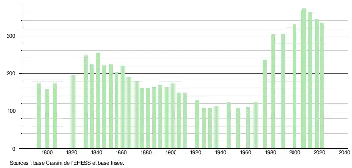 L'évolution du nombre d'habitants est connue à travers les recensements de la population effectués dans la commune depuis 1793. Pour les communes de moins de 10 000 habitants, une enquête de recensement portant sur toute la population est réalisée tous les cinq ans, les populations légales des années intermédiaires étant quant à elles estimées par interpolation ou extrapolation[15]. Pour la commune, le premier recensement exhaustif entrant dans le cadre du nouveau dispositif a été réalisé en 2007[16].