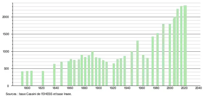 L'évolution du nombre d'habitants est connue à travers les recensements de la population effectués dans la commune depuis 1793. Pour les communes de moins de 10 000 habitants, une enquête de recensement portant sur toute la population est réalisée tous les cinq ans, les populations légales des années intermédiaires étant quant à elles estimées par interpolation ou extrapolation[28]. Pour la commune, le premier recensement exhaustif entrant dans le cadre du nouveau dispositif a été réalisé en 2005[29].
