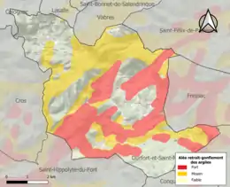 La commune est vulnérable au risque de mouvements de terrains constitué principalement du retrait-gonflement des sols argileux[25]. Cet aléa est susceptible d'engendrer des dommages importants aux bâtiments en cas d’alternance de périodes de sécheresse et de pluie. 58,4 % de la superficie communale est en aléa moyen ou fort (67,5 % au niveau départemental et 48,5 % au niveau national). Sur les 411 bâtiments dénombrés sur la commune en 2019, 247 sont en aléa moyen ou fort, soit 60 %, à comparer aux 90 % au niveau départemental et 54 % au niveau national. Une cartographie de l'exposition du territoire national au retrait gonflement des sols argileux est disponible sur le site du BRGM[26],[Carte 2].