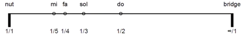 Par exemple, si la corde à vide donne un Do, le Sol a pour fréquence N = No (1 + 1/2). Il se joue donc avec la frette au [(1/2/(1+1/2)]=1/3 de la longueur.