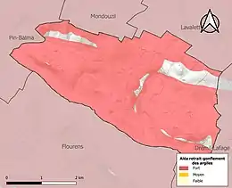 Le retrait-gonflement des sols argileux est susceptible d'engendrer des dommages importants aux bâtiments en cas d’alternance de périodes de sécheresse et de pluie. 91,8 % de la superficie communale est en aléa moyen ou fort (88,8 % au niveau départemental et 48,5 % au niveau national). Sur les 637 bâtiments dénombrés sur la commune en 2019, 608 sont en aléa moyen ou fort, soit 95 %, à comparer aux 98 % au niveau départemental et 54 % au niveau national. Une cartographie de l'exposition du territoire national au retrait gonflement des sols argileux est disponible sur le site du BRGM[24],[Carte 3].
