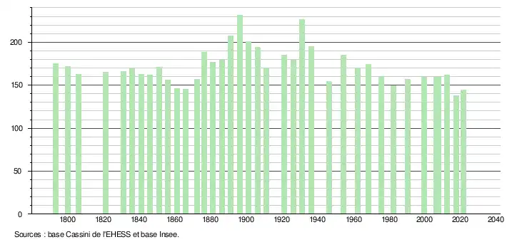L'évolution du nombre d'habitants est connue à travers les recensements de la population effectués dans la commune depuis 1793. Pour les communes de moins de 10 000 habitants, une enquête de recensement portant sur toute la population est réalisée tous les cinq ans, les populations légales des années intermédiaires étant quant à elles estimées par interpolation ou extrapolation[35]. Pour la commune, le premier recensement exhaustif entrant dans le cadre du nouveau dispositif a été réalisé en 2007[36].