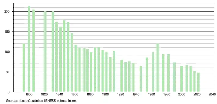 L'évolution du nombre d'habitants est connue à travers les recensements de la population effectués dans la commune depuis 1793. Pour les communes de moins de 10 000 habitants, une enquête de recensement portant sur toute la population est réalisée tous les cinq ans, les populations légales des années intermédiaires étant quant à elles estimées par interpolation ou extrapolation[20]. Pour la commune, le premier recensement exhaustif entrant dans le cadre du nouveau dispositif a été réalisé en 2006[21].