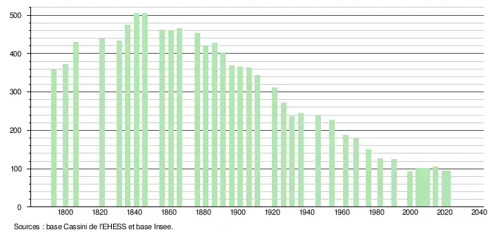 L'évolution du nombre d'habitants est connue à travers les recensements de la population effectués dans la commune depuis 1793. Pour les communes de moins de 10 000 habitants, une enquête de recensement portant sur toute la population est réalisée tous les cinq ans, les populations légales des années intermédiaires étant quant à elles estimées par interpolation ou extrapolation[17]. Pour la commune, le premier recensement exhaustif entrant dans le cadre du nouveau dispositif a été réalisé en 2004[18].