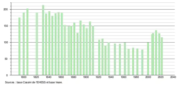 L'évolution du nombre d'habitants est connue à travers les recensements de la population effectués dans la commune depuis 1793. Pour les communes de moins de 10 000 habitants, une enquête de recensement portant sur toute la population est réalisée tous les cinq ans, les populations légales des années intermédiaires étant quant à elles estimées par interpolation ou extrapolation[20]. Pour la commune, le premier recensement exhaustif entrant dans le cadre du nouveau dispositif a été réalisé en 2007[21].