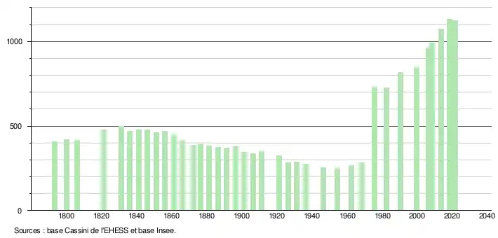 L'évolution du nombre d'habitants est connue à travers les recensements de la population effectués dans la commune depuis 1793. Pour les communes de moins de 10 000 habitants, une enquête de recensement portant sur toute la population est réalisée tous les cinq ans, les populations légales des années intermédiaires étant quant à elles estimées par interpolation ou extrapolation[57]. Pour la commune, le premier recensement exhaustif entrant dans le cadre du nouveau dispositif a été réalisé en 2008[58].