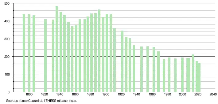 L'évolution du nombre d'habitants est connue à travers les recensements de la population effectués dans la commune depuis 1793. Pour les communes de moins de 10 000 habitants, une enquête de recensement portant sur toute la population est réalisée tous les cinq ans, les populations légales des années intermédiaires étant quant à elles estimées par interpolation ou extrapolation[14]. Pour la commune, le premier recensement exhaustif entrant dans le cadre du nouveau dispositif a été réalisé en 2008[15].