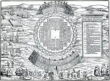 Vingt et un ans plus tard, en 1556, le livre du Vénitien Giovanni Battista Ramusio Delle Navigationi et Viaggi comprend, outre un récit du voyage de Cartier, une carte de Giacomo Gastaldi intitulée La Terra De Hochelaga Nella Nova Francia, où les trois sommets du mont Royal sont fidèlement reproduits[7]. Cartier revient ensuite à Stadaconé le et y passe l'hiver. Lors de son troisième voyage, en 1541, Jacques Cartier, devenu subalterne de Roberval, fonde la colonie de Charlesbourg-Royal. L'année suivante, Roberval arrive à Charlesbourg-Royal qu'il renomme France-Roy. Tous deux, séparément, reviennent à la bourgade de Hochelaga, alors détruite. Ils essaient de passer outre aux saults[8] qui avaient jusqu'alors bloqué l'avance dans l'intérieur des Indes occidentales.