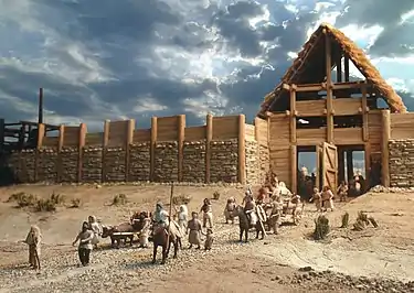 Des analyses dendrochronologiques effectuées sur des bois issus de la même forêt que ceux de la fortification celtique du Mont Vully permettent de dater l'édification de celle-ci aux environs de 124 av. J.-C.[9] Le mobilier archéologique en lien avec cette structure remonte pour sa part à La Tène finale et appartient majoritairement à une phase comprise entre 120 et 80 av. J.-C (La Tène D1b). Durant son utilisation, le rempart fait à un moment donné l'objet d'une réfection, comme l'atteste la présence d'un second parement externe édifié devant le premier. À cette occasion, la rampe subit également une extension[10]. Comme le montre l'épaisse couche d'incendie dégagée à l'intérieur de la fortification[9], la destruction du rempart semble liée à un incendie généralisé des superstructures en bois, telles que les tours édifiées au-dessus des casemates[10]. Les chercheurs ont longtemps considéré que cet incendie pouvait être mis en lien avec un épisode raconté par Jules César dans les Commentaires de la Guerre des Gaules. Il s'agit du passage se rapportant à la migration des Helvètes, et où l'auteur indique qu'avant leur départ en 58 av. J.-C, ces derniers boutent le feu à leurs villes, fermes et villages afin de s'interdire toute possibilité de retour et dissuader les Germains de venir s'installer sur le Plateau Suisse à leur place[11]. Outre les indices évidents d'incendie, l'hypothèse d'une correspondance entre le texte de César et la destruction de l'oppidum du Mont Vully reposait sur la base d'une datation de la couche stratigraphique calcinée effectuée essentiellement à partir d'une fibule de type Nauheim, qui constitue un fossile directeur. Cependant, des révisions opérées dans la chronologie de La Tène ont conduit à un vieillissement des différentes phases appartenant à cette époque. Ainsi, le mobilier appartenant à l'horizon des fibules de Nauheim apparait en réalité plus ancien que ce qui avait été supposé jusqu'alors. Par conséquent, il en est de même de l'incendie de l'oppidum du Mont Vully. La destruction de la fortification ne se situe donc pas en 58 av. J.-C., aux prémices de la guerre des Gaules, mais plutôt aux alentours de 80 av. J.-C.[9] Cet événement ne marque toutefois pas la fin de l'occupation du site, puisqu'une réoccupation de faible envergure est attestée localement dans le deuxième quart du premier siècle av. J.-C.[12]