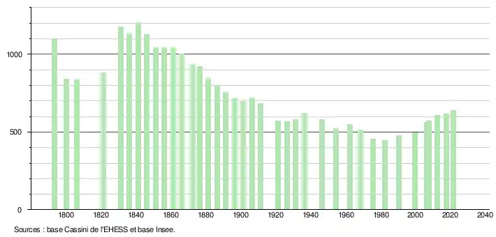 L'évolution du nombre d'habitants est connue à travers les recensements de la population effectués dans la commune depuis 1793. Pour les communes de moins de 10 000 habitants, une enquête de recensement portant sur toute la population est réalisée tous les cinq ans, les populations légales des années intermédiaires étant quant à elles estimées par interpolation ou extrapolation[23]. Pour la commune, le premier recensement exhaustif entrant dans le cadre du nouveau dispositif a été réalisé en 2007[24].