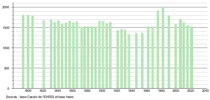 L'évolution du nombre d'habitants est connue à travers les recensements de la population effectués dans la commune depuis 1793. Pour les communes de moins de 10 000 habitants, une enquête de recensement portant sur toute la population est réalisée tous les cinq ans, les populations légales des années intermédiaires étant quant à elles estimées par interpolation ou extrapolation[23]. Pour la commune, le premier recensement exhaustif entrant dans le cadre du nouveau dispositif a été réalisé en 2005[24].