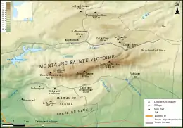 Le massif de la Sainte-Victoire s'étend sur 18 kilomètres de long et sur 5 kilomètres de large[10], suivant une stricte orientation ouest-est. Il se situe principalement dans le département des Bouches-du-Rhône et en partie dans celui du Var, et, avec ses abords, sur les communes de Puyloubier, Saint-Antonin-sur-Bayon, Rousset, Châteauneuf-le-Rouge, Beaurecueil, Le Tholonet, Vauvenargues, Saint-Marc-Jaumegarde, Pourrières, Artigues et Rians.