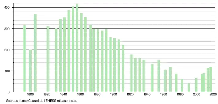 L'évolution du nombre d'habitants est connue à travers les recensements de la population effectués dans la commune depuis 1793. Pour les communes de moins de 10 000 habitants, une enquête de recensement portant sur toute la population est réalisée tous les cinq ans, les populations légales des années intermédiaires étant quant à elles estimées par interpolation ou extrapolation[2]. Pour la commune, le premier recensement exhaustif entrant dans le cadre du nouveau dispositif a été réalisé en 2008[3].