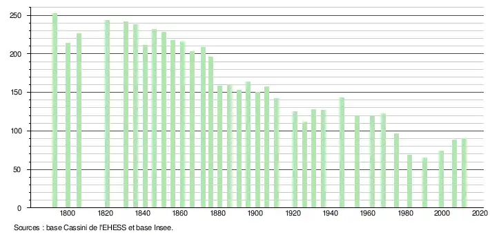 - Dans le tableau des recensements et le graphique, par convention dans Wikipédia, le principe a été retenu, pour les populations légales postérieures à 1999 de n’afficher dans le tableau des recensements et le graphique que les populations correspondant à l'année 2006, première population légale publiée calculée conformément aux concepts définis dans le décret no 2003-485 du 5 juin 2003, et les années correspondant à une enquête exhaustive de recensement pour les communes de moins de 10 000 habitants, ainsi que la dernière population légale publiée par l’Insee.