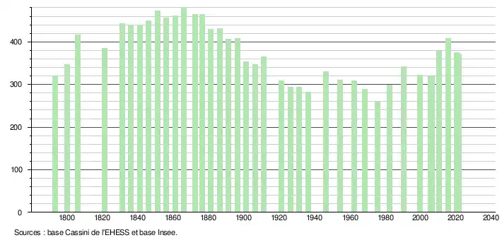 L'évolution du nombre d'habitants est connue à travers les recensements de la population effectués dans la commune depuis 1793. Pour les communes de moins de 10 000 habitants, une enquête de recensement portant sur toute la population est réalisée tous les cinq ans, les populations légales des années intermédiaires étant quant à elles estimées par interpolation ou extrapolation[16]. Pour la commune, le premier recensement exhaustif entrant dans le cadre du nouveau dispositif a été réalisé en 2005[17].