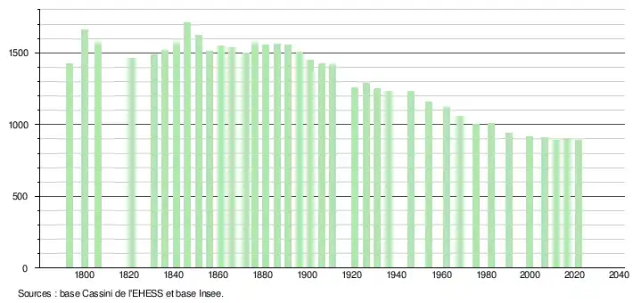 L'évolution du nombre d'habitants est connue à travers les recensements de la population effectués dans la commune depuis 1793. Pour les communes de moins de 10 000 habitants, une enquête de recensement portant sur toute la population est réalisée tous les cinq ans, les populations légales des années intermédiaires étant quant à elles estimées par interpolation ou extrapolation[23]. Pour la commune, le premier recensement exhaustif entrant dans le cadre du nouveau dispositif a été réalisé en 2006[24].