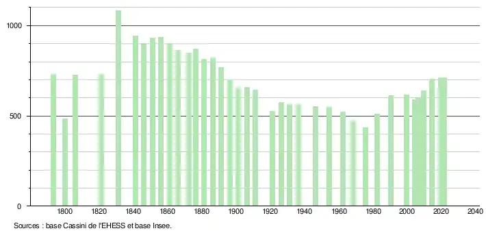 | L'évolution du nombre d'habitants est connue à travers les recensements de la population effectués dans la commune depuis 1793. Pour les communes de moins de 10 000 habitants, une enquête de recensement portant sur toute la population est réalisée tous les cinq ans, les populations légales des années intermédiaires étant quant à elles estimées par interpolation ou extrapolation[24]. Pour la commune, le premier recensement exhaustif entrant dans le cadre du nouveau dispositif a été réalisé en 2004[25]. En 2021, la commune comptait 711 habitants[Note 4], en augmentation de 0,99 % par rapport à 2015 (Gers : +0,79 %, France hors Mayotte : +1,84 %). |