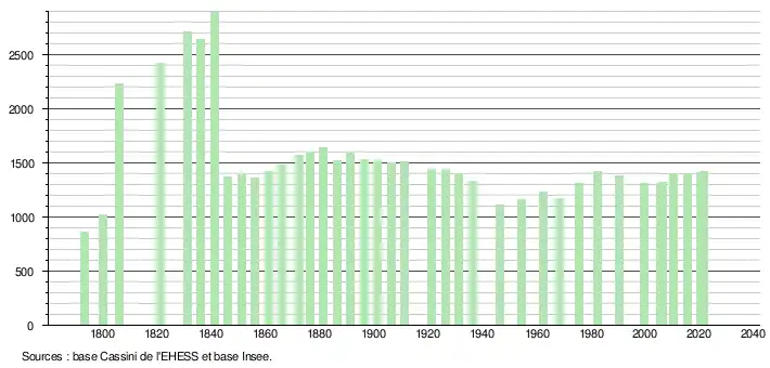 L'évolution du nombre d'habitants est connue à travers les recensements de la population effectués dans la commune depuis 1793. Pour les communes de moins de 10 000 habitants, une enquête de recensement portant sur toute la population est réalisée tous les cinq ans, les populations légales des années intermédiaires étant quant à elles estimées par interpolation ou extrapolation[45]. Pour la commune, le premier recensement exhaustif entrant dans le cadre du nouveau dispositif a été réalisé en 2005[46].