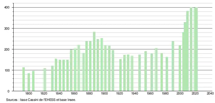 L'évolution du nombre d'habitants est connue à travers les recensements de la population effectués dans la commune depuis 1793. Pour les communes de moins de 10 000 habitants, une enquête de recensement portant sur toute la population est réalisée tous les cinq ans, les populations légales des années intermédiaires étant quant à elles estimées par interpolation ou extrapolation[17]. Pour la commune, le premier recensement exhaustif entrant dans le cadre du nouveau dispositif a été réalisé en 2004[18].