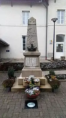 Le monument aux morts situé devant la mairie sur la place du village est un pilier commémoratif avec une colonne quadrangulaire en pierre artificielle d'une longueur de 1,65 m et d’une hauteur de 3,20 m[30]. Il y est inscrit 14 noms de soldats français disparus ou morts pour le pays. 13 d’entre eux ont combattu durant la 1ère Guerre Mondiale ; un seul lors de la Seconde Guerre Mondiale. 10 sont originaires de Montboillon alors que les autres sont nés ou morts dans les environs. Les noms de soldats sont classés dans l’ordre alphabétique et le dessus du monument porte la mention « A NOS MORTS ».
