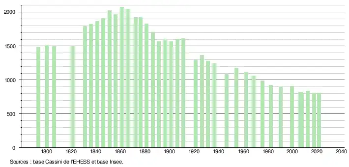 L'évolution du nombre d'habitants est connue à travers les recensements de la population effectués dans la commune depuis 1793. Pour les communes de moins de 10 000 habitants, une enquête de recensement portant sur toute la population est réalisée tous les cinq ans, les populations légales des années intermédiaires étant quant à elles estimées par interpolation ou extrapolation[30]. Pour la commune, le premier recensement exhaustif entrant dans le cadre du nouveau dispositif a été réalisé en 2007[31].