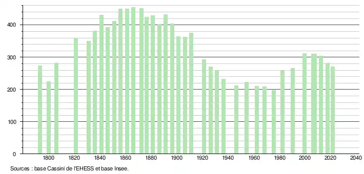 L'évolution du nombre d'habitants est connue à travers les recensements de la population effectués dans la commune depuis 1793. Pour les communes de moins de 10 000 habitants, une enquête de recensement portant sur toute la population est réalisée tous les cinq ans, les populations légales des années intermédiaires étant quant à elles estimées par interpolation ou extrapolation[18]. Pour la commune, le premier recensement exhaustif entrant dans le cadre du nouveau dispositif a été réalisé en 2007[19].