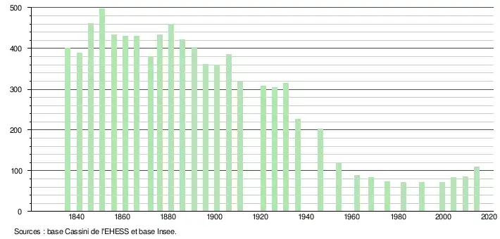 L'évolution du nombre d'habitants est connue à travers les recensements de la population effectués dans la commune depuis 1836. À partir du , les populations légales des communes sont publiées annuellement dans le cadre d'un recensement qui repose désormais sur une collecte d'information annuelle, concernant successivement tous les territoires communaux au cours d'une période de cinq ans. Pour les communes de moins de 10 000 habitants, une enquête de recensement portant sur toute la population est réalisée tous les cinq ans, les populations légales des années intermédiaires étant quant à elles estimées par interpolation ou extrapolation[5]. Pour la commune, le premier recensement exhaustif entrant dans le cadre du nouveau dispositif a été réalisé en 2004[6],[Note 1].