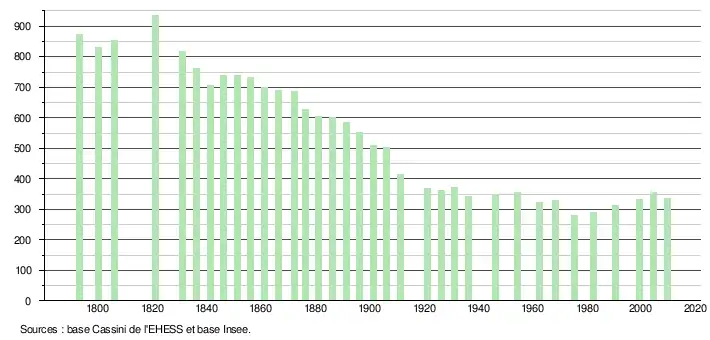 L'évolution du nombre d'habitants est connue à travers les recensements de la population effectués dans la commune depuis 1793. À partir du , les populations légales des communes sont publiées annuellement dans le cadre d'un recensement qui repose désormais sur une collecte d'information annuelle, concernant successivement tous les territoires communaux au cours d'une période de cinq ans. Pour les communes de moins de 10 000 habitants, une enquête de recensement portant sur toute la population est réalisée tous les cinq ans, les populations légales des années intermédiaires étant quant à elles estimées par interpolation ou extrapolation[9]. Pour la commune, le premier recensement exhaustif entrant dans le cadre du nouveau dispositif a été réalisé en 2004[10],[Note 2].
