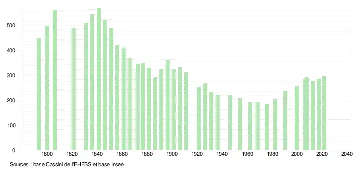 L'évolution du nombre d'habitants est connue à travers les recensements de la population effectués dans la commune depuis 1793. Pour les communes de moins de 10 000 habitants, une enquête de recensement portant sur toute la population est réalisée tous les cinq ans, les populations légales des années intermédiaires étant quant à elles estimées par interpolation ou extrapolation[29]. Pour la commune, le premier recensement exhaustif entrant dans le cadre du nouveau dispositif a été réalisé en 2007[30].