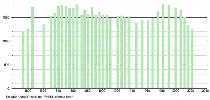 L'évolution du nombre d'habitants est connue à travers les recensements de la population effectués dans la commune depuis 1793. Pour les communes de moins de 10 000 habitants, une enquête de recensement portant sur toute la population est réalisée tous les cinq ans, les populations légales des années intermédiaires étant quant à elles estimées par interpolation ou extrapolation[30]. Pour la commune, le premier recensement exhaustif entrant dans le cadre du nouveau dispositif a été réalisé en 2006[31].