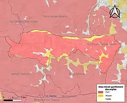 La commune est vulnérable au risque de mouvements de terrains constitué principalement du retrait-gonflement des sols argileux[24]. Cet aléa est susceptible d'engendrer des dommages importants aux bâtiments en cas d’alternance de périodes de sécheresse et de pluie. 97,1 % de la superficie communale est en aléa moyen ou fort (76,3 % au niveau départemental et 48,5 % au niveau national). Sur les 179 bâtiments dénombrés sur la commune en 2019, 153 sont en aléa moyen ou fort, soit 85 %, à comparer aux 90 % au niveau départemental et 54 % au niveau national. Une cartographie de l'exposition du territoire national au retrait gonflement des sols argileux est disponible sur le site du BRGM[25],[Carte 3].