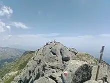 Le sommet du Monte Formicula avec sa croix sommitale et un marquage du GR 20.