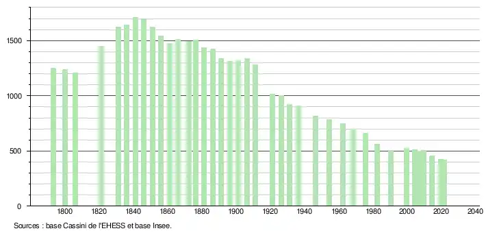 L'évolution du nombre d'habitants est connue à travers les recensements de la population effectués dans la commune depuis 1793. Pour les communes de moins de 10 000 habitants, une enquête de recensement portant sur toute la population est réalisée tous les cinq ans, les populations légales des années intermédiaires étant quant à elles estimées par interpolation ou extrapolation[24]. Pour la commune, le premier recensement exhaustif entrant dans le cadre du nouveau dispositif a été réalisé en 2004[25].
