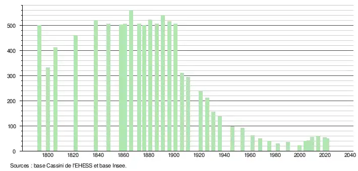 L'évolution du nombre d'habitants est connue à travers les recensements de la population effectués dans la commune depuis 1793. Pour les communes de moins de 10 000 habitants, une enquête de recensement portant sur toute la population est réalisée tous les cinq ans, les populations légales des années intermédiaires étant quant à elles estimées par interpolation ou extrapolation[15]. Pour la commune, le premier recensement exhaustif entrant dans le cadre du nouveau dispositif a été réalisé en 2004[16].