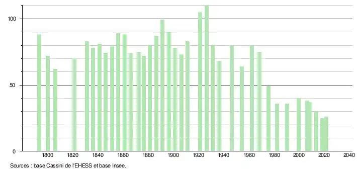 L'évolution du nombre d'habitants est connue à travers les recensements de la population effectués dans la commune depuis 1793. Pour les communes de moins de 10 000 habitants, une enquête de recensement portant sur toute la population est réalisée tous les cinq ans, les populations légales des années intermédiaires étant quant à elles estimées par interpolation ou extrapolation[39]. Pour la commune, le premier recensement exhaustif entrant dans le cadre du nouveau dispositif a été réalisé en 2008[40].