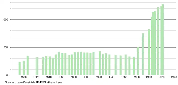 L'évolution du nombre d'habitants est connue à travers les recensements de la population effectués dans la commune depuis 1793. Pour les communes de moins de 10 000 habitants, une enquête de recensement portant sur toute la population est réalisée tous les cinq ans, les populations légales des années intermédiaires étant quant à elles estimées par interpolation ou extrapolation[40]. Pour la commune, le premier recensement exhaustif entrant dans le cadre du nouveau dispositif a été réalisé en 2004[41].