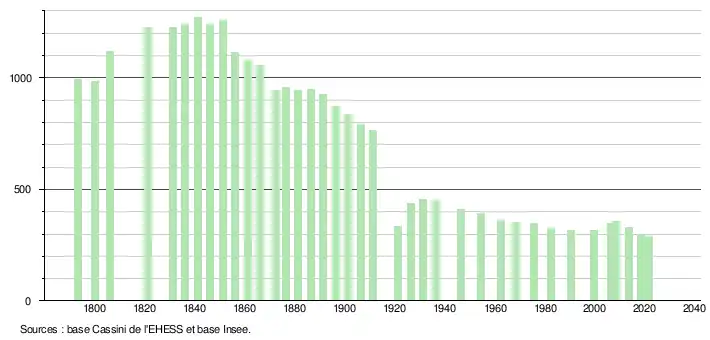 L'évolution du nombre d'habitants est connue à travers les recensements de la population effectués dans la commune depuis 1793. Pour les communes de moins de 10 000 habitants, une enquête de recensement portant sur toute la population est réalisée tous les cinq ans, les populations légales des années intermédiaires étant quant à elles estimées par interpolation ou extrapolation[17]. Pour la commune, le premier recensement exhaustif entrant dans le cadre du nouveau dispositif a été réalisé en 2008[18].
