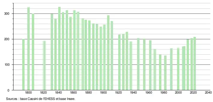 L'évolution du nombre d'habitants est connue à travers les recensements de la population effectués dans la commune depuis 1793. Pour les communes de moins de 10 000 habitants, une enquête de recensement portant sur toute la population est réalisée tous les cinq ans, les populations légales des années intermédiaires étant quant à elles estimées par interpolation ou extrapolation[19]. Pour la commune, le premier recensement exhaustif entrant dans le cadre du nouveau dispositif a été réalisé en 2007[20].